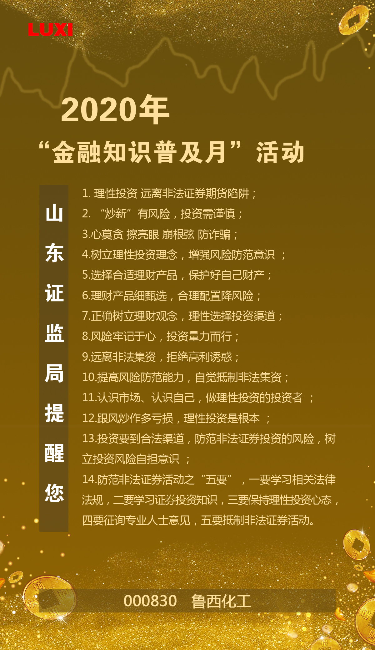 2020年“金融知識普及月”活動,山東證監(jiān)局提醒您:1. 理性投資 遠離非法證券期貨陷阱; 2. “炒新”有風(fēng)險,投資需謹(jǐn)慎; 3.心莫貪 擦亮眼 崩根弦 防詐騙; 4.樹立理性投資理念,增強風(fēng)險防范意識 ; 5.選擇合適理財產(chǎn)品,保護好自己財產(chǎn); 6.理財產(chǎn)品細甄選,合理配置